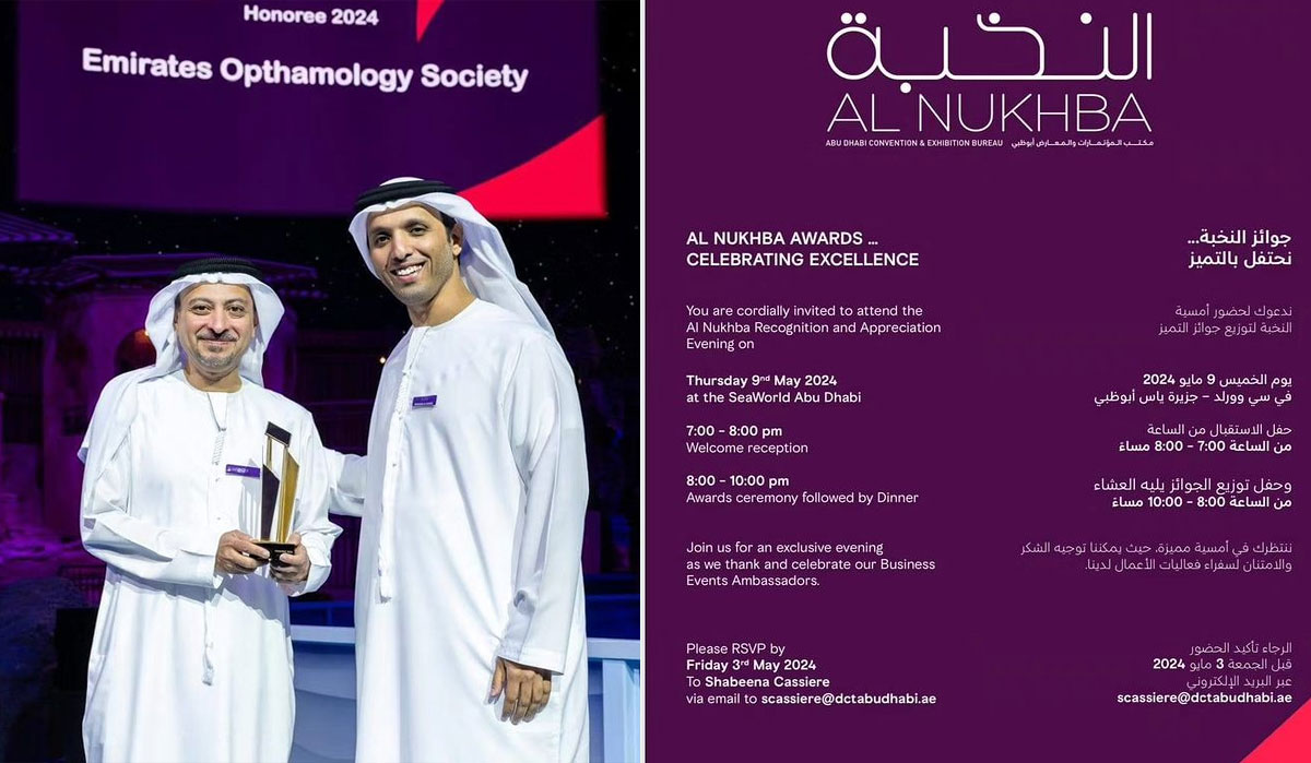 At the Al Nukhba event on the night of May 9th, 2024, Dr. Khaled Abu Haleeqa, Vice President of the Emirates Society of Ophthalmology, receives an award on behalf of the Society . The award is presented by Mr. Mubarak H. Alshamsi, Director of the Abu Dhabi Convention and Exhibition Bureau. This honor recognizes the strategic relationship and long-standing collaboration between the bureau and the Emirates Society of Ophthalmology over the years.